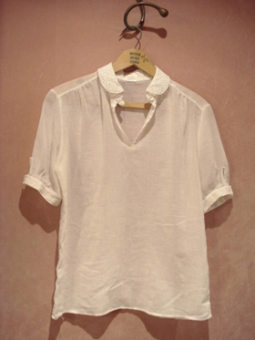 すっきりとシンプルなデザインのこちら。ポコポコとカットされた襟裳とが女性らしいブラウス。