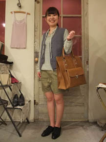 left:(今年初のなま足です!!)イタリア軍のショートパンツとヴィンテージのベストに合わせて少年っぽく*大きめのBagで色をプラスしました♪