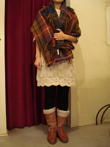 縦に2等分したブランケットをニットワンピースにさらりと合わせて。