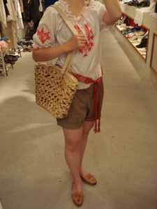 真っ赤な夏らしいベルトとカゴバックをポイントに。