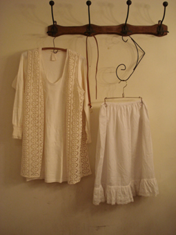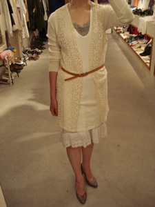 裾から覗かせたペチコートのレースと白い編みベストで女度アップ◎足元はパンプスで大人に。