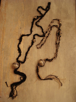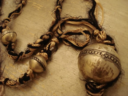 大小2種類のビーズボールを4種類、異素材のロープとテープを使い編み上げたもの。