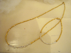 ゴールドビーズと大きさの不揃いなパールでできた、ネックレスとブレスレットです。