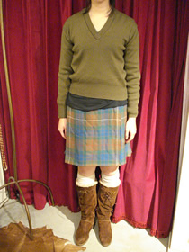 珍しい色合いのチェック柄、巻きスカートにはシンプルなVネックニットを合わせ、ちょっぴりスクール風に。