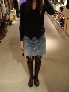 履いてみると膝下までくる丈なのでこんな風にショートブーツを合わせ、タイツで遊ぶのも良いですね~