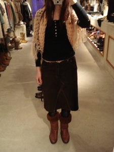 小さめムートンベストにぺたんこブーツを合わせたボヘミアンスタイル♪
