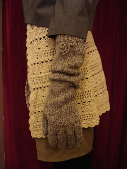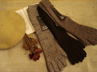 クシュっとさせて履くも良し、こんなショート丈ジャケットやコートに合わせ、ひじまで伸ばして履くも良しです。
