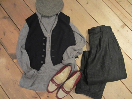 ヴィンテージベストにブラックのパンツでマニッシュなスタイル