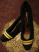 ゴールドのテープ ラインがお洒落な なブルーとブラックパンプ