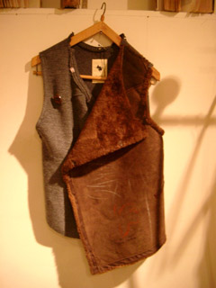 胸元を覆うデットストックのシープスキンにはランダムなつぎはぎが入る。