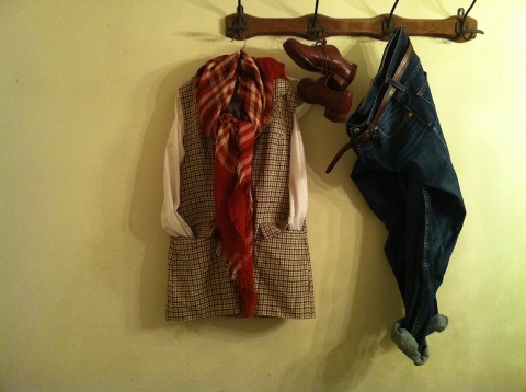 チェック柄のジャケットをリメイクしたベストにシャツ、