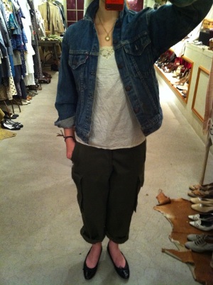 ミリタリーパンツにレースキャミソール。