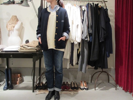 カーディガンを合わせたスタイルや